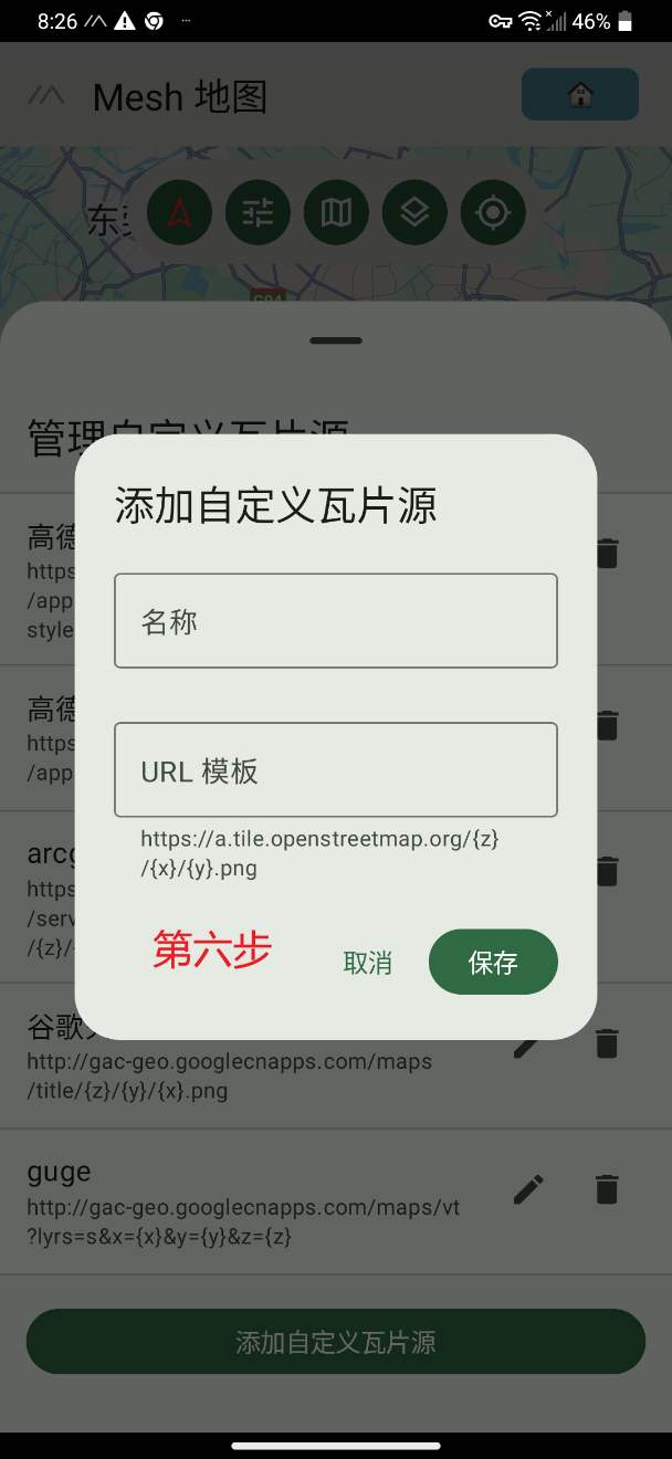 第六步:名称随意,url需要复合模版规范,同时目前仅支持wgs84坐标系的瓦片图源,例如:ArcGIS图源(84坐标)